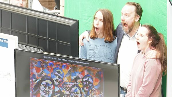 Beginnen konnte man den erlebnisreichen Tag in der SmartFactoryOWL mit der KI-Fotobox. Unter dem Motto „Kreativität in Echtzeit“ erschuf die Künstliche Intelligentz (KI) künstlerische Portraits in nur kurzer Zeit. „Sie war ein Highlight der Veranstaltung und zog zahlreiche Besucherinnen und Besucher an, die auf der Suche nach einem einzigartigen visuellen Erlebnis waren!“, so Julian Bültemeier, wissenschaftlicher Mitarbeiter am inIT. Mit der sogenannten Neural-Style-Transfer-Technologie wurden unzählige Fotos in beeindruckende Kunstwerke, z.B. im Stil von van Gogh, Munch oder Kandinsky, verwandelt. Die Personen wählten ihre künstlerischen Lieblingsstile, lächelten in die Kamera und nahmen ihre persönlichen Meisterwerke direkt als Download auf ihr Handy oder per E-Mail mit nach Hause. Zusätzlich waren hier die aktuellen Forschungen des inIT im Bereich der Dokumentensicherheit sowie die Gefahren beim Umgang mit KI ein häufiges Gesprächsthema.