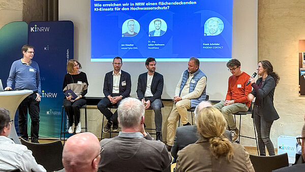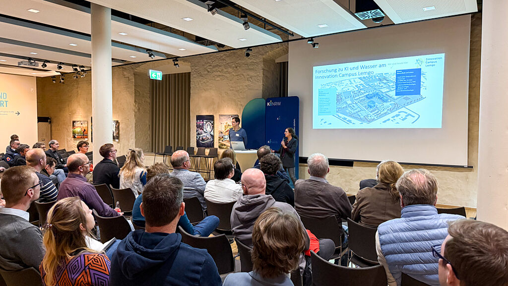 Beim KI Meetup NRW „KI & Wasser“ am 18. November 2025 kamen Interessierte aus Kommunen, der Wasserwirtschaft, kleinen und mittleren Unternehmen sowie aus Forschung und Lehre im Weserrenaissance-Museum Schloss Brake zusammen, um über nachhaltige KI-Lösungen zu diskutieren. Die Veranstaltung wurde von KI.NRW, der AICommunityOWL, dem inIT und der KI-Akademie OWL gemeinsam organisiert. Prof. Dr. Markus Lange-Hegermann leitete den Abend zusammen mit Monika Löber (KI.NRW) und Nissrin Heymann (Fraunhofer IOSB-INA) und stellte gemeinsam mit seinen wissenschaftlichen Mitarbeitern Nico Baumgart, Sebastian Becker und Ruwen Fulek die KI-Akademie OWL vor.