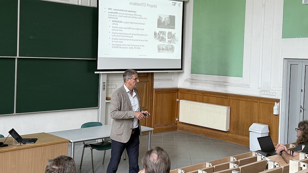 Im Rahmen seines Besuchs hielt Prof. Dr. Ulrich Büker eine Gastvorlesung und präsentierte unter anderem aktuelle Forschungsvorhaben des inIT – darunter auch das Projekt NeMo.bil, das ein neuartiges schwarmbasiertes Mobilitätskonzept untersucht, sowie das Projekt enableATO, das automatisierten Bahnverkehr als Bestandteil nachhaltiger Mobilität im ländlichen Raum untersucht.