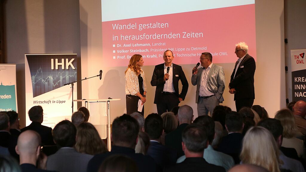 „Wie lässt sich der Wandel in herausfordernden Zeiten gestalten?“ Diese Frage stand im Mittelpunkt der von Julia Wunderlich (FTZ, Transfer und Forschungskommunikation) moderierten Talkrunde. Sie diskutierte mit TH-OWL-Präsident Professor Dr. Jürgen Krahl, Landrat Dr. Axel Lehmann und Volker Steinbach, Präsident der IHK Lippe, über aktuelle und künftige Entwicklungen und Forschungsaktivitäten sowie über notwendige politische und unternehmerische Maßnahmen, aber auch über bestehende Risiken für die Region.