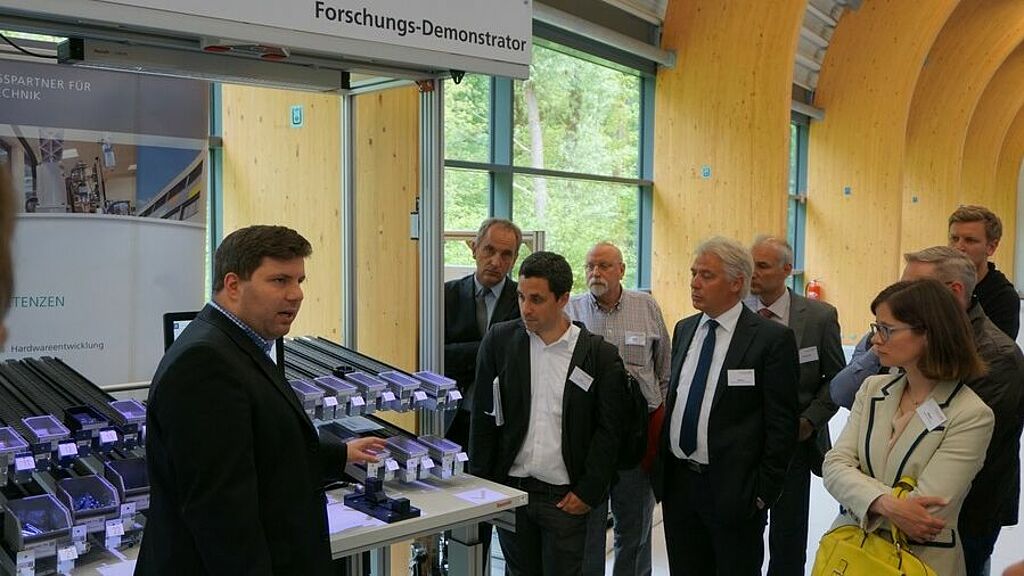 Nach thematischen Einführungsvorträgen von Judith Binzer, VDMA Forum Industrie 4.0, und Professor Jasperneite, Leiter des Fraunhofer-Anwendungszentrums IOSB-INA und des Instituts für industrielle Informationstechnik (inIT) der Hochschule OWL, besichtigten die Teilnehmer das Forschungs- und Entwicklungszentrum CIIT und die Forschungsfabrik SmartFactoryOWL der Fraunhofer-Gesellschaft und der Hochschule OWL. Dort erlebten die mittelständischen Unternehmer, wie die intelligente Produktion von morgen aussehen könnte und nahmen viele Anregungen zur Umsetzung im eigenen Unternehmen mit. Forscher der Hochschule OWL und des Fraunhofer-Instituts IOSB-INA präsentierten den Gästen praxisnahe Umsetzungen für den Mittelstand. An verschiedenen Demonstratoren aus den Themenfeldern Intelligente Entwicklung, Intelligente Montagetechnik und Intelligente Automation zeigten die Lemgoer Wissenschaftler aktuelle Industrie 4.0-Forschungsansätze und Anwendungsszenarien.