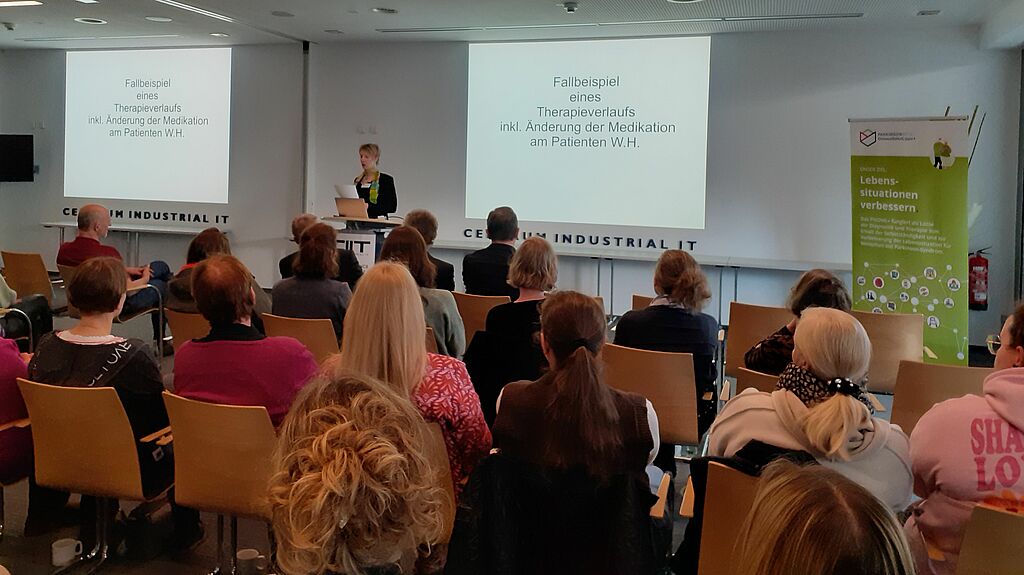 Im Rahmen der dritten interprofessionellen Fallkonferenz stellte Jennifer Leyendecker, freiberufliche klinische Linguistin, einen Fall aus ihrer Praxis vor. Ihr Beitrag zeigte sehr anschaulich, wie schnell sich der Zustand eines Patienten verschlechtern kann, wenn eine falsche ärztliche Zweitmeinung zu einer Änderung der Medikation führt. Das Fallbeispiel machte deutlich, wie wichtig eine gut abgestimmte medikamentöse Versorgung im Alltag von Parkinsonpatientinnen und -Patienten ist.
