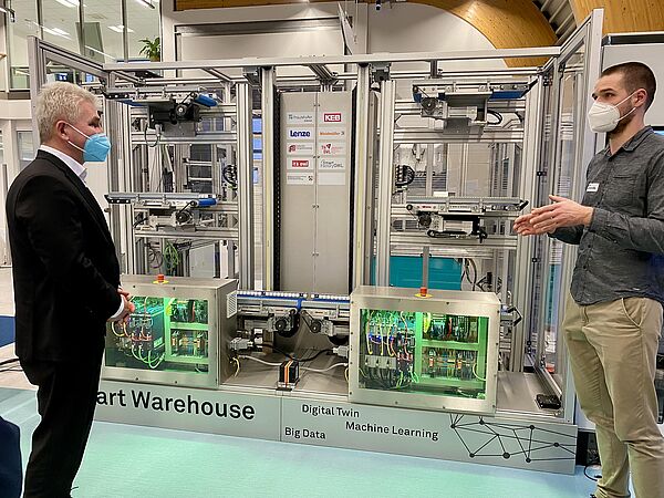 In addition to the discussion, Minister Pinkwart was also shown real 5G use cases at SmartFactoryOWL. inIT employees Lukas Martenvormfelde and Dr. Lukasz Wisniewski presented the Smart Warehouse, where 5G-based augmented reality applications are implemented to support maintenance and service work.