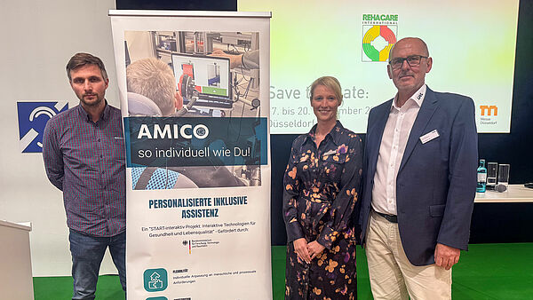 At REHACARE 2025, Alex Kuhn (inIT), Anja Große-Coosmann (Wertkreis Gütersloh) and Frank Schrapper (LWL Inclusion Office for Work) presented AMICO.