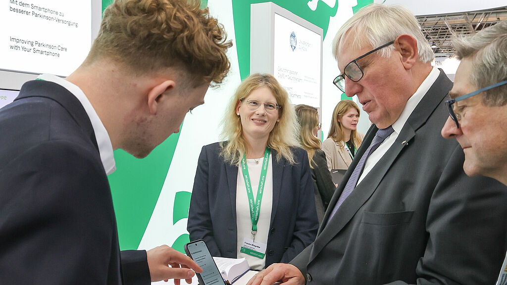 The Institute Industrial IT (inIT) at Technische Hochschule OWL was represented in Hall 3 at the joint stand of the state of North Rhine-Westphalia, where it presented the PD-Assist smartphone app. The application for Parkinson's patients was developed in cooperation with OWL University Hospital, Clinic for Neurology and Neurogeriatrics, headed by Prof. Dr. Christoph Redecker, Campus Klinikum Lippe. The interdisciplinary research team of Frauke Wiegräbe and Patrick Gaudl from the Discrete Systems research group headed by Prof. Dr. Volker Lohweg was particularly pleased to welcome Karl-Josef Laumann, Minister of Labour, Health and Social Affairs of the State of North Rhine-Westphalia. The Minister spoke to the scientific inIT staff about the research and development of the Parkinson's app and welcomed the use of the digital support tool as part of user-centred healthcare for those affected in OWL.