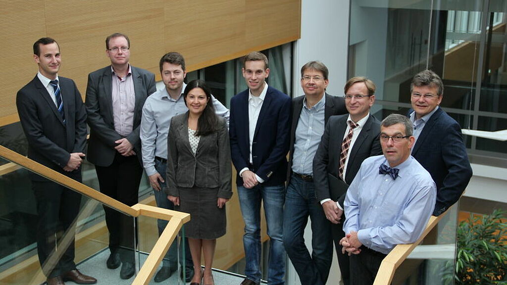 Take the plunge: Project parnters of the research project “smartBN” at kick-off meeting at CENTRUM INDUSTRIAL IT (CIIT): (f.l.t.r.) Emmanuel Thony (KBA-NotaSys), Prof. Michael Hübner (Ruhr-Universität Bochum), Mark Funk (inIT), Dr. Helene Dörksen (inIT), Matthias Scharf (ILT.NRW), Prof. Volker Lohweg (inIT), Dr. Alexander Knobloch (Diebold Nixdorf AG), Johannes Schaede (KBA-NotaSys), Prof. Hans-Jürgen Danneel (ILT.NRW).