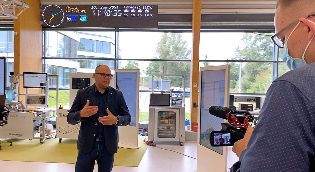 As part of the second 5G.NRWeek organized by the 5G.NRW Competence Center, a virtual trip to the 5G test and demo centers in North Rhine-Westphalia was on the agenda on Friday, September 10. The SmartFactoryOWL, a joint facility of the Ostwestfalen-Lippe University of Applied Sciences and Arts and Fraunhofer IOSB-INA, was also a destination of this trip, as this is where the first 5G campus network in East Westphalia went into operation at the beginning of 2020. inIT board member Dr. Lukasz Wisniewski, together with his Fraunhofer colleagues Dr. Sebastian Schriegel and Timo Siekmann, presented the current research work on the located 5G system.