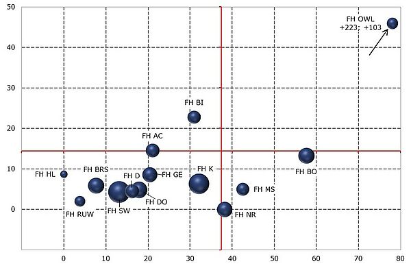 Forschungserfolg in in der Elektrotechnik der NRW-Fachhochschulen je Wissenschaftsstelle 2011 zu 2014