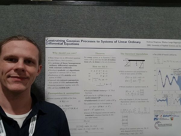 The research assistant from Prof. Markus Lange-Hegermann's working group "Mathematics and Data Science" presented the paper entitled "Constraining Gaussian Processes to Systems of Linear Ordinary Differential Equations" to the very interested audience at a poster session. It will be published shortly in the NeurIPS conference proceedings.