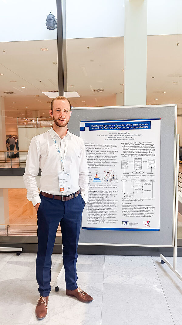 Jonas Janzen, research assistant in the Interconnected Automation Systems research group led by Prof. Dr. Henning Trsek, presented a poster at the congress on the topic of ‘Investigating Dynamic Configuration of TSN-based Industrial Networks for Real-Time OPC UA Field eXchange Applications’.