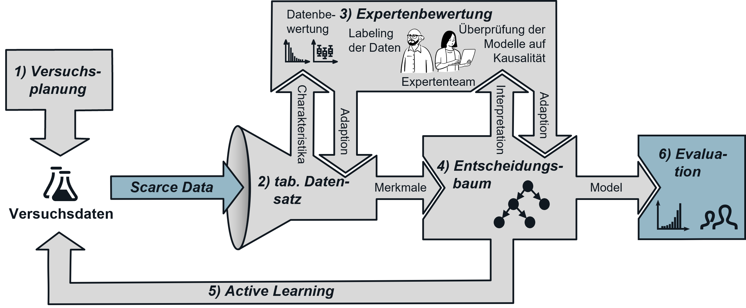 Figure 2: The workflow for handling sparse data comprises 1) experimental design with optimised SLHDs, 2) tabular preparation of the data, 3) expert evaluation, 4) analysis using decision trees (M5’, GUIDE), iterative model improvement through 5) active learning, and 6) evaluation of new data points with visualised decision tracking.