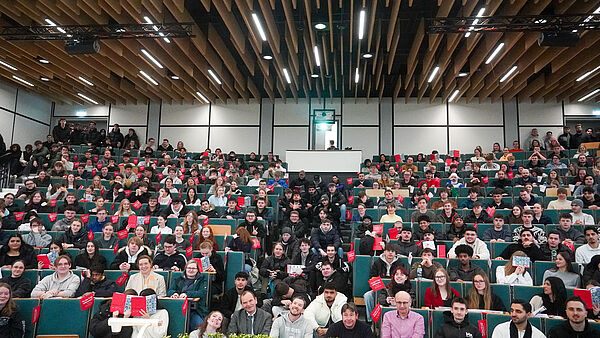 inIT also actively participated in the regular program of the university information days in the morning. Prof. Dr. Markus Lange-Hegermann presented the Data Science study programme. As part of the presentation of the Medical and Health Technology degree program, Frauke Wiegräbe, research assistant at inIT, and Patrick Gaudl, student associate, showed the Parkinson's app developed at inIT and thus made it clear how closely the degree program is linked to practical research at the institute. Prof. Dr. Lukasz Wisniewski left the stage to his student Arved Sachau, who gave the audience a direct insight into the practical side of his Digital Management Solutions degree course. Arved'sexperiences illustrated the practical approach and the immediate applicability of what he had learned, which was particularly inspiring for the prospective students present.