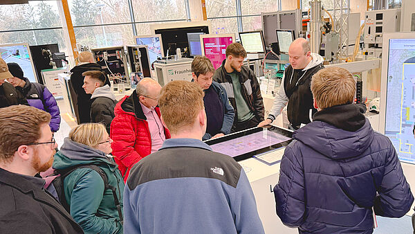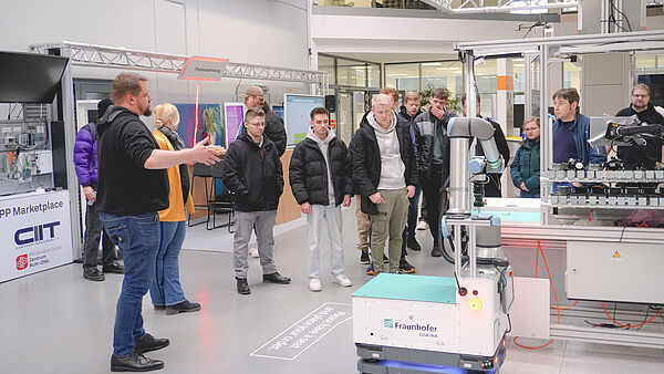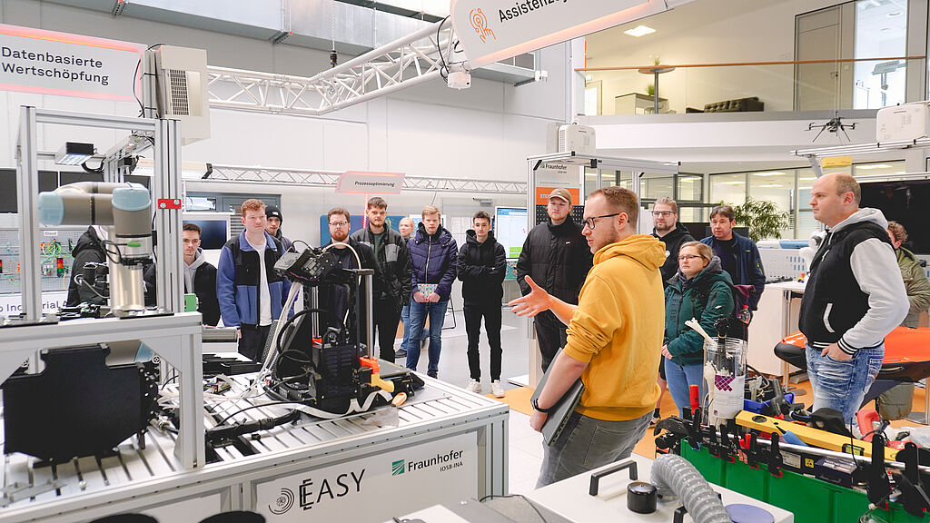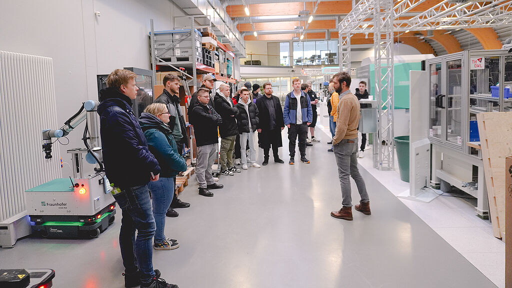 As part of the Information Days of the TH OWL, the Dietrich-Bonhoeffer-Berufskolleg Detmold accepted the invitation of Jasmin Zilz, inIT office, to an exciting tour of the SmartFactoryOWL for the IT trainees specializing in system integration and data and process analysis as well as for the upper school of the FOS Informatik. As both inIT trainees will successfully complete their training this year and are subsequently planning to study at the TH OWL, the event offered a valuable opportunity to gain practical insights into the choice of course and possible everyday working life, as Jasmin Zilz summed up.
