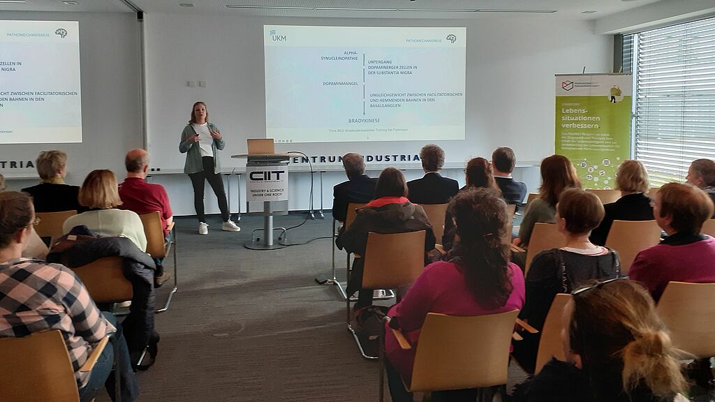 Lena Frenz, physiotherapist and therapy scientist at Münster University Hospital, presented the concept "Think BIG! - Amplitude-based training for Parkinson's disease". This is an intensive therapy in which Parkinson's patients learn to move better and speak more clearly with large movements and targeted speech training. The training takes place over several weeks and is then continued independently at home. It helps those affected to perceive and control their movements more consciously, which improves the movement sequence. At the same time, it helps them to articulate their speech more clearly - a common problem with Parkinson's.