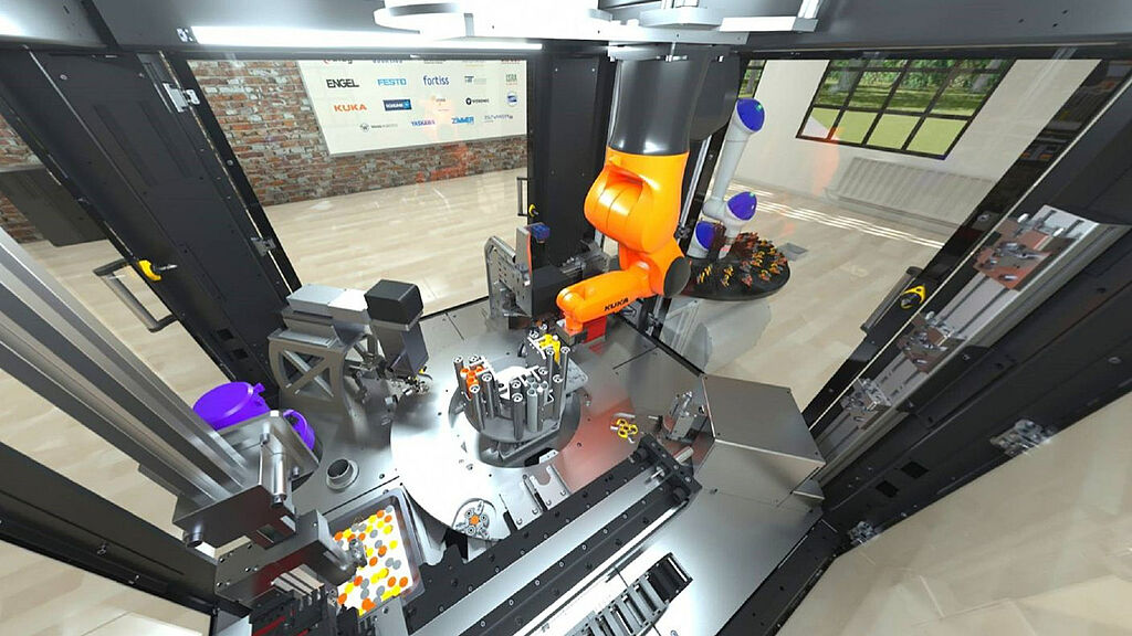 The visualization of a modular assembly process (manufacturing cell for fidget spinners) serves as an example here. It is intended to illustrate the added value of cross-manufacturer interoperability based on digital twins with OPC UA. A virtual discovery tour through the manufacturing cell allows easy navigation through the object-oriented architecture of the system. Almost every component of the cell represents itself as a digital twin (OPC UA node) and thus provides all kinds of information and interaction options. For example, standardized interfaces can be used to execute component skills or to retrieve or monitor static and dynamic process data. This can be used to create entire control sequences by orchestrating component skills or to perform process analyses for optimization or monitoring.