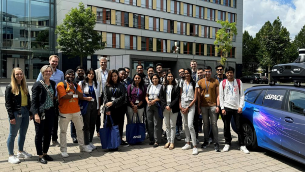 At dSPACE, a leading provider of simulation and validation solutions for the automotive industry, the students were able to see first-hand how the company supports car manufacturers in simulation and validation. The programme included presentations on "Simulating Autonomous Vehicles" and "Tools for Developing and Testing AI for Automated Driving". Maria Thümmler and Melanie Even from dSPACE led the students through various stations and also presented a sensor-based test vehicle to the students.