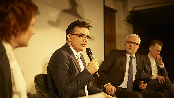 Round table discussion at the SOHO house in Berlin (from left): Moderator Eva Schmidt, Prof. Jürgen Jasperneite, Minister of Economic Affairs Garrelt Duin and Mads Pankow.