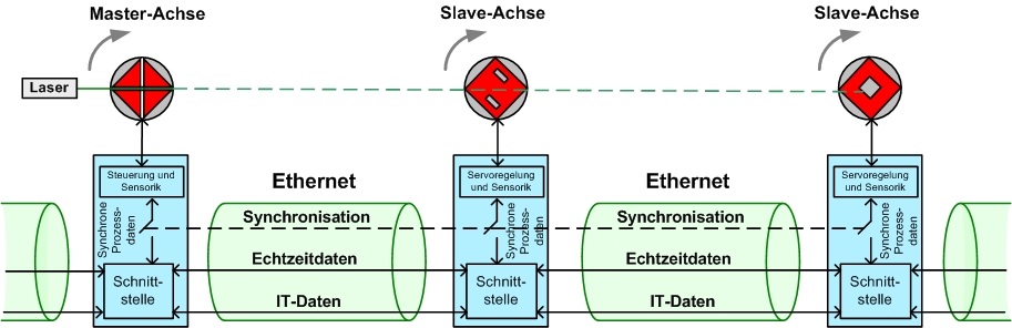 Um koordinierte Bewegungsabläufe realisieren zu können (Motion Control), sind performante Kommunikationssysteme mit hoher Echtzeitfähigkeit und synchroner Prozessdatenverarbeitung notwendig. Ethernet-Netzwerke bieten die geforderten Eigenschaften zunächst nicht. Mit Hilfe von Protokollen, wie PROFINET IO mit IRT oder IEEE 1588, welche auf den Ethernet-Standard aufbauen, können die erforderlichen Eigenschaften jedoch erreicht werden.